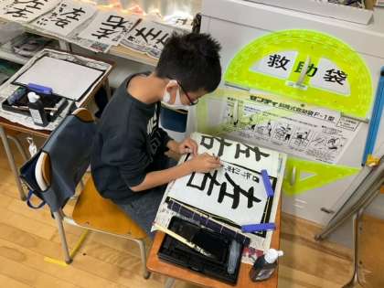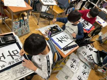 習字の時間です。今日の題字は、「左右」です。はらいと、とめを意識して書くことが大事ですね。