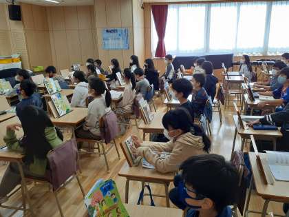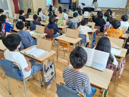 音楽の時間です。下北沢文化祭で演じてるときを想像して、歌の練習をしました。教室によい声が響いていました。