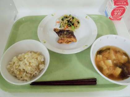 献立 菊花ご飯、さばの竜田揚げ、白菜のお浸し、豆腐のみそ汁、牛乳