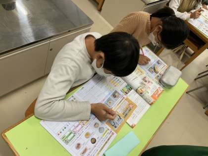 家庭科の時間です。「朝食から健康な1日の生活を」3日間の朝食の写真を見て、良い点と課題点を考えています。