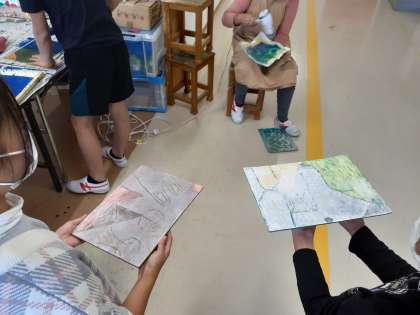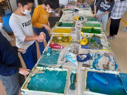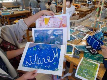 図工の時間です。色の組み合わせを考えて想像豊かな版画が出来上がっていきます。