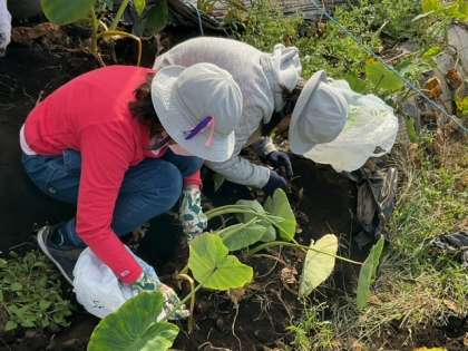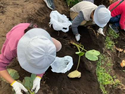一つの株に、たくさんのさといもがついています。楽しみに待っていてください。