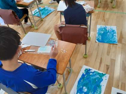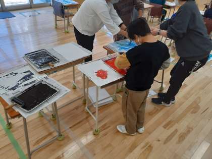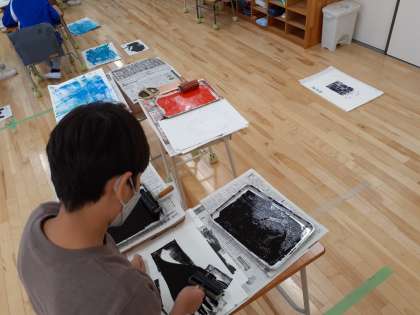 図工の時間です。うらしまの海にいる生き物を版画にしています。表情豊かな作品が出来上がっています。