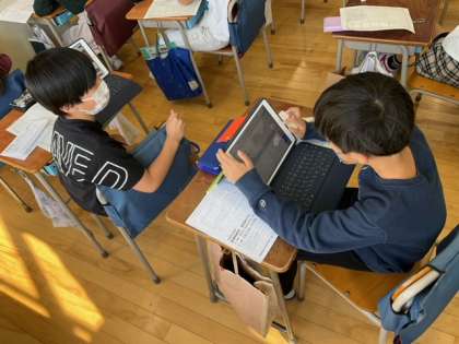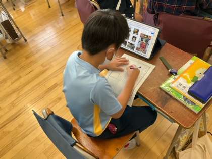 社会科の時間です。区内めぐりのまとめをしています。お互いの原稿を読み合ったり、考えを伝え合ったりしながら学習を進めています。