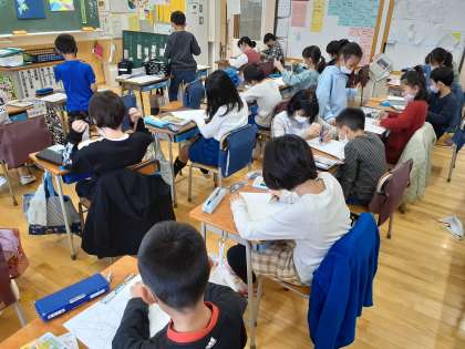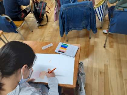 図工の時間です。線の組み合わせで形をつくっています。みんなの色の塗り方がとても丁寧でした。
