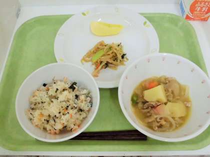 献立 にんじゃご飯、塩肉じゃが、野菜のごまだれかけ、りんご、牛乳