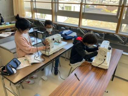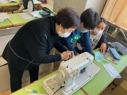家庭科の時間です。ミシンに挑戦しています。安全な使い方をしっかりと守って、学習を進めています。