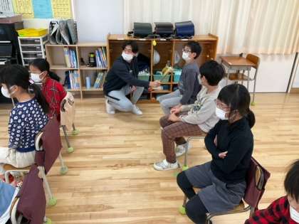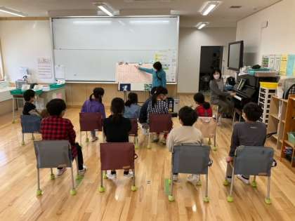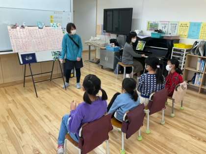音楽の時間です。みんなで「まっかな秋」を歌っています。ソロのパートもあります。