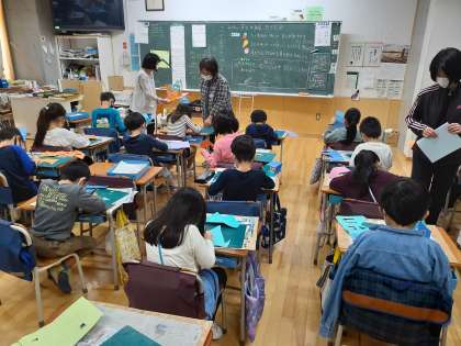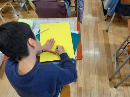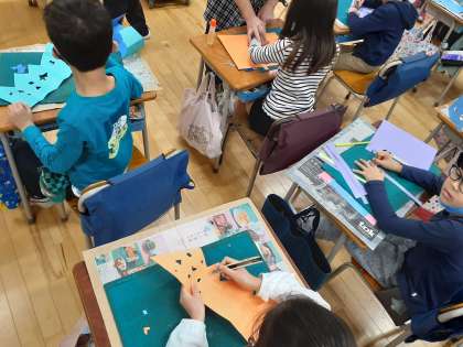 図工の時間です。カッターを上手に使って、窓のある建物を作っています。サポーターの方々が安全に使えるように手伝いにきてくれました。