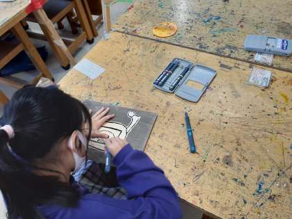 図工の時間です。版画の製作も随分すすんできました。片付けも一生懸命できました。