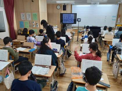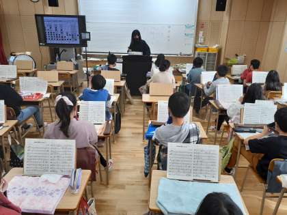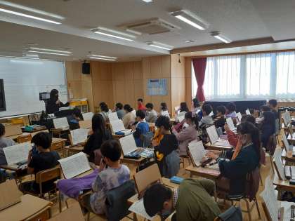 音楽の時間です。リコーダーで「威風堂々」を練習しました。♭があるので少し難しそうです。