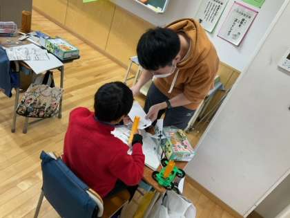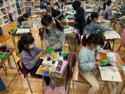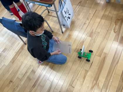 理科の時間です。風の力で動く車を作っています。風を受けて、速く動くように工夫しています。