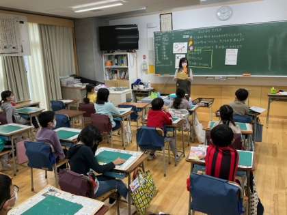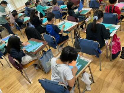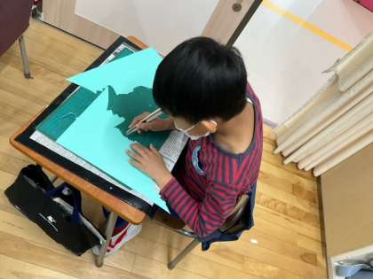 図工の時間です。「まどのある たてもの」カッターを使って、窓の開け方や建物の形を工夫して作っていきます。
