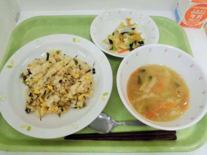 献立 高菜チャーハン、白菜のとろとろ中華スープ、パリパリサラダ、牛乳