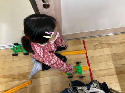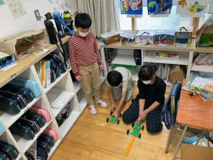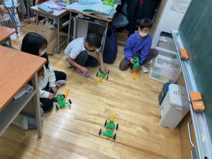 理科の時間です。ゴムで動く車を走らせて、ゴムの伸びや車の走る様子を調べています。