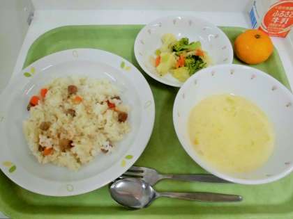 献立 ハムピラフ、コーンポタージュ、花野菜サラダ、みかん、牛乳