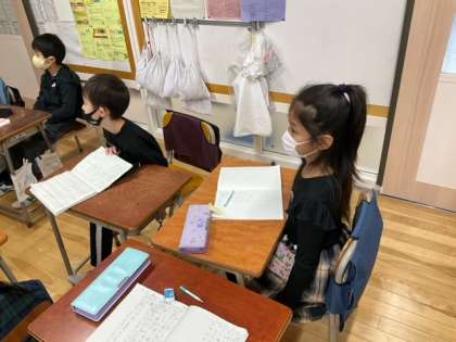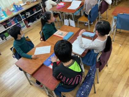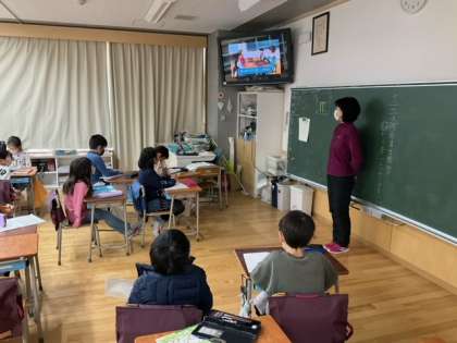 国語の時間です。「そうだんにのってください」学習ビデオを視聴して、話し合いでまねしたいところを考えています。
