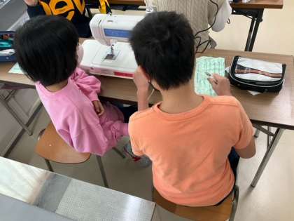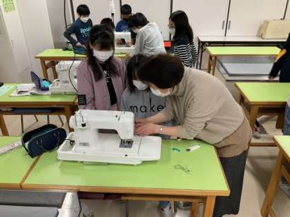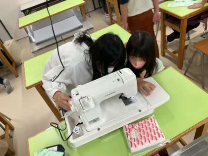 家庭科の時間です。「ミシンにトライ! 手づくりで楽しい生活」安全に気をつけて、教え合いながら学習を進めています。