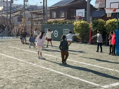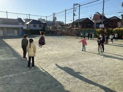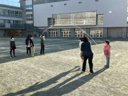 長なわとびで8の字跳びに挑戦しています。陽射しの気持ち良い朝です。
