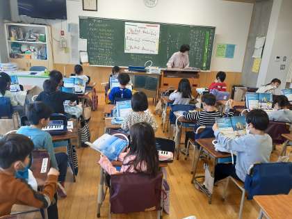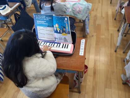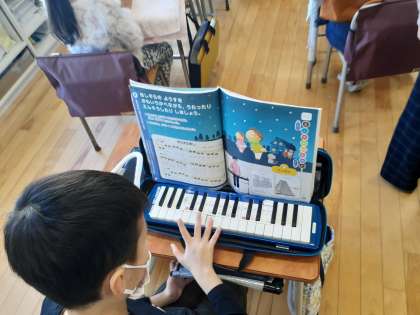音楽の時間です。きらきら星が鍵盤ハーモニカで弾けるように練習しました。