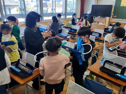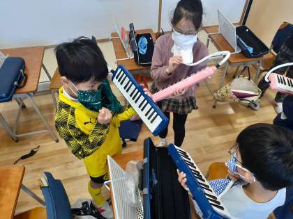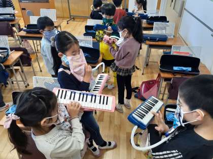 音楽の時間です。「こぎつね」を友達と鍵盤ハーモニカの音を合わせて練習しました。