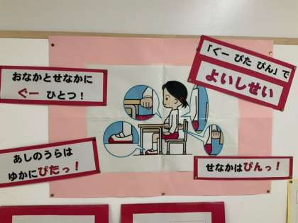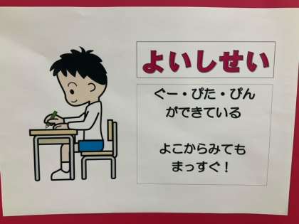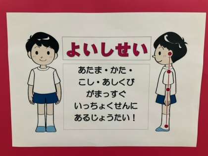 保健室前の掲示物を紹介します。姿勢の大切さを伝える掲示物です。よい姿勢は、集中力アップにもつながります。