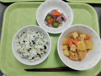 献立 わかめご飯、じゃが芋のそぼろ煮、大根のゆかり和え、牛乳