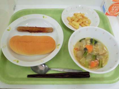 献立 セルフウインナードッグ、ABCスープ、フレンチポテト、牛乳