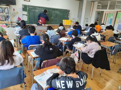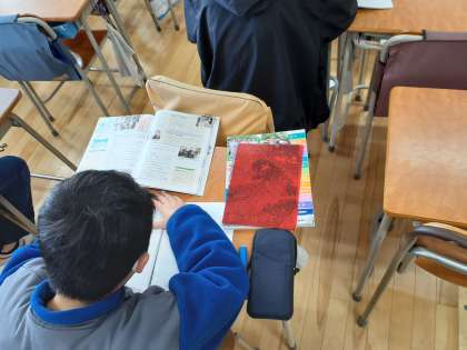 社会の時間です。資料から読み取れるところに線を引いて、まとめる姿がありました。