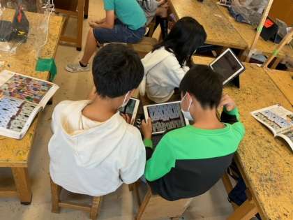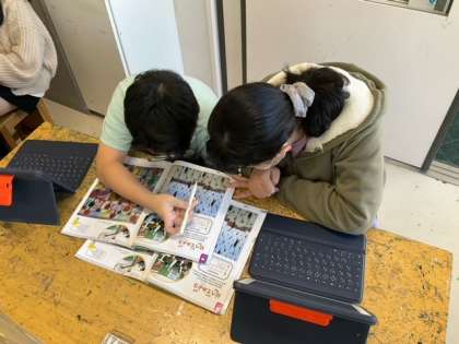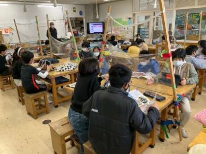 図工の時間です。「比べてみよう」2つの作品「ゴルコンダ」と「リズミカルな森のラクダ」の共通点を見つけています。