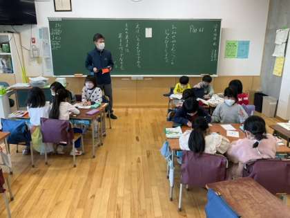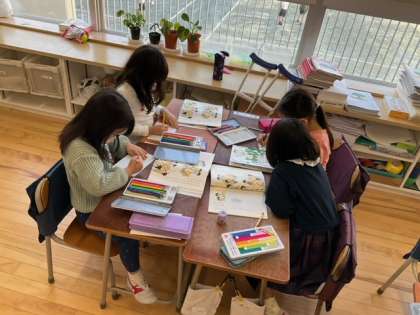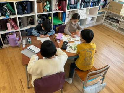 国語の時間です。「おみせやさんごっこ」の準備をしています。ものすごく楽しそうです。