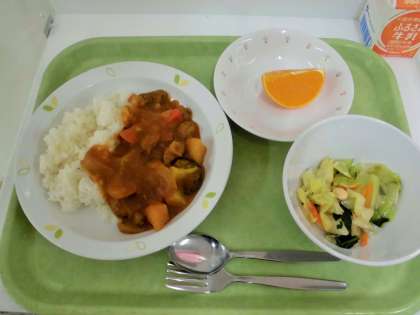 献立 冬野菜カレーライス、大豆入りゆで野菜、ゆめオレンジ、牛乳