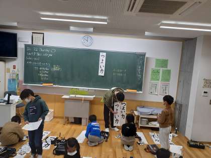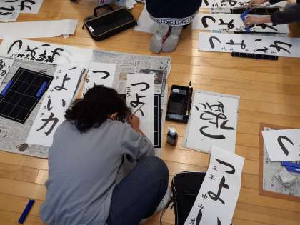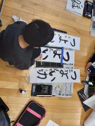 書写の時間です。書き初めの練習をしました。3年生は「つよい子」です。