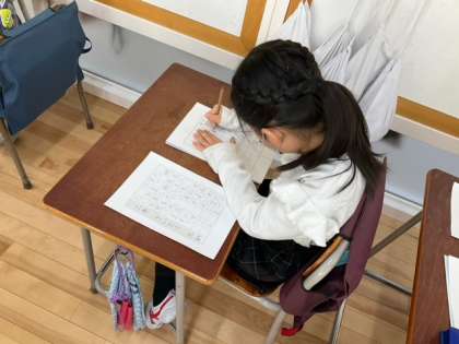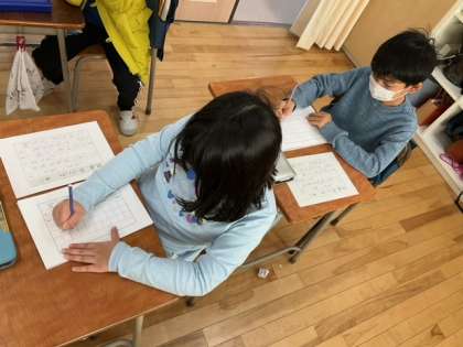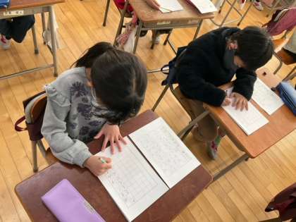 国語の時間です。書き初めの練習をしています。2年生は硬筆です。お手本をよく見て、一文字一文字ていねいに書きましょう!