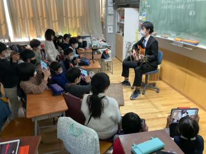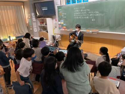 「みんな 2学期 よくがんばったね!」そんな思いを込めて、先生から弾き語りのプレゼントがありました。いいシーンでした。