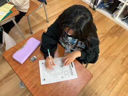 算数の時間です。「九九のもようをつくろう」九九の答えの一の位の数字を直線で順番に結ぶと、どんなことがわかるかな?