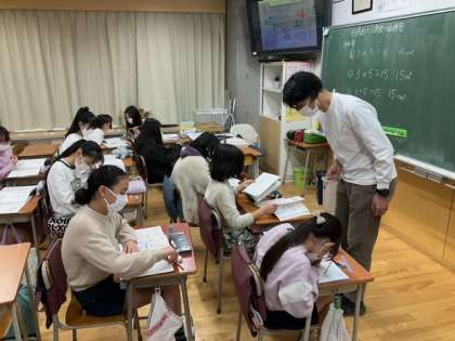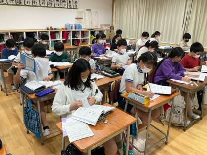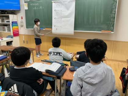 算数の時間です。「四角形や三角形の面積」既習事項を生かして、図形の面積を求めていきます。