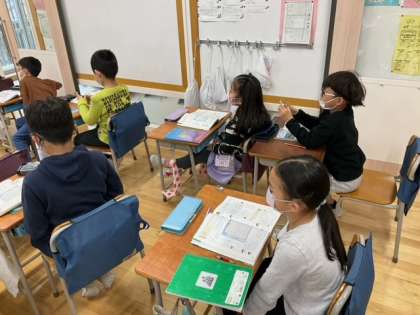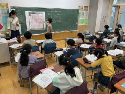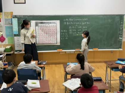 算数の時間です。九九の表を見て、同じ答えが三つになるときには、どんなことが考えられるのかを発表しています。