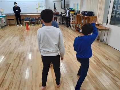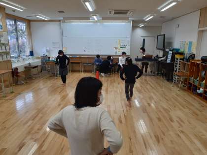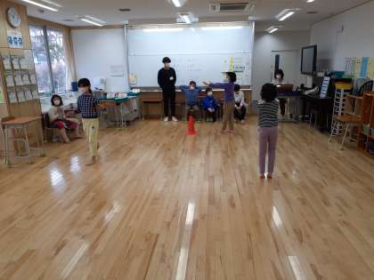 リトミックの時間です。大好きな曲に合わせて体を動かしました。