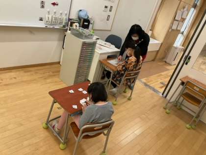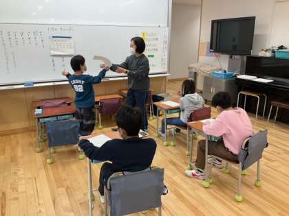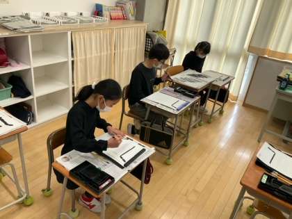 グループ学習の時間です。カレンダーを使って算数の学習をしたり、毛筆に取り組んだりしています。