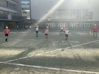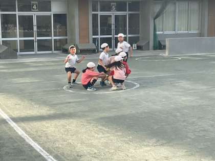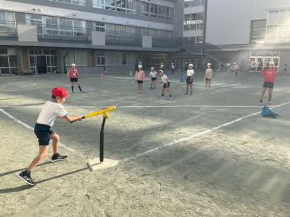 体育の時間です。Tボールの試合をしています。声をかけ合って、協力しながら試合を進めています。