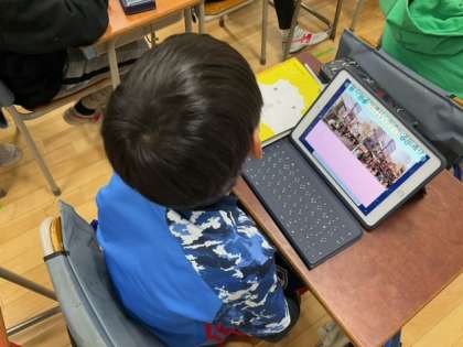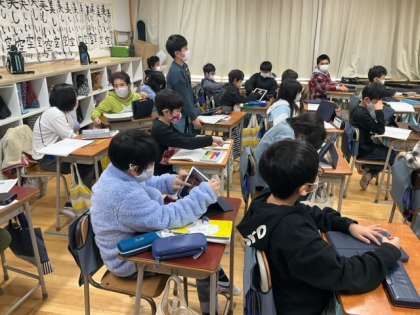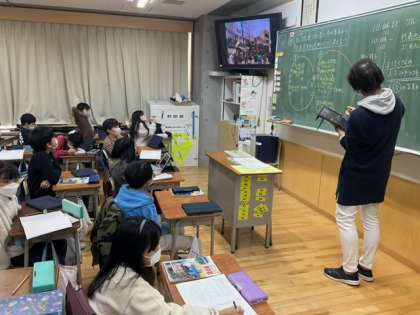 社会科の時間です。伝法院通りの昔と今の写真を比較して、伝統を生かした町づくりを考えています。