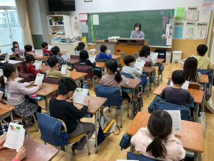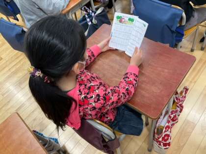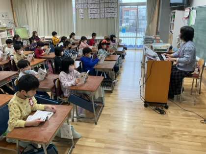 音楽の時間です。「森のくまさん」を2つのグループで輪唱しています。かわいらしい声の追いかけっこですね。