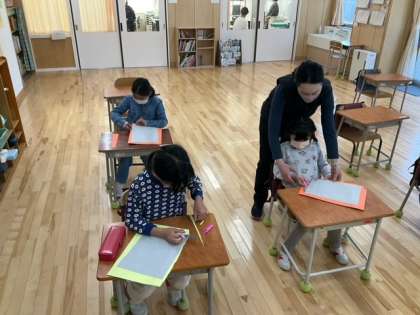 図工の時間です。「まるめて おって」ハサミを上手に使って、まずは箱を作っていきます。