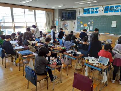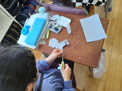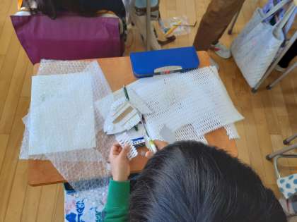 図工の時間です。工作用紙と様々な素材を組み合わせて版をつくっています。どんな版画になるのか楽しみです。