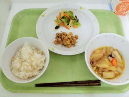 献立 発芽玄米入りご飯、豚肉と大根のうま煮、大豆とじゃこの甘辛揚げ、小松菜のお浸し、牛乳