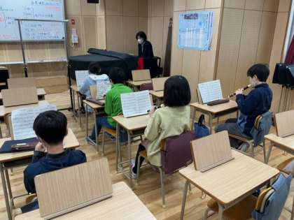 音楽の時間です。合奏の練習が進んでいます。気持ちを合わせて、すてきな演奏を作り上げてくださいね。