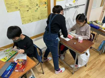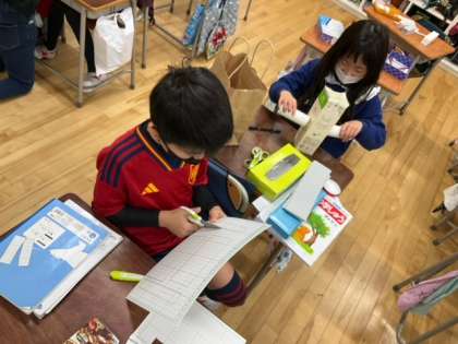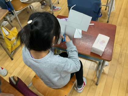 算数の時間です。箱を使ったり、方眼紙で形を作ったりしながら、立体の学習をしています。