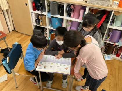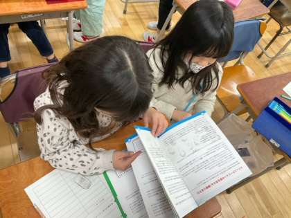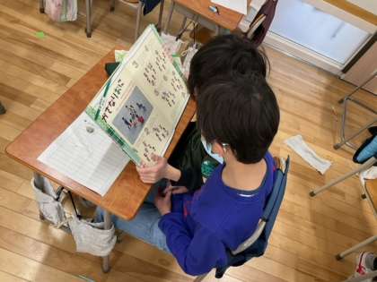国語の時間です。自分たちにできそうな遊びについて、本を読みながら説明し合っています。
