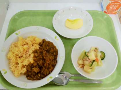 献立 ごぼう入りドライカレーライス、ツナポテサラダ、りんご、牛乳